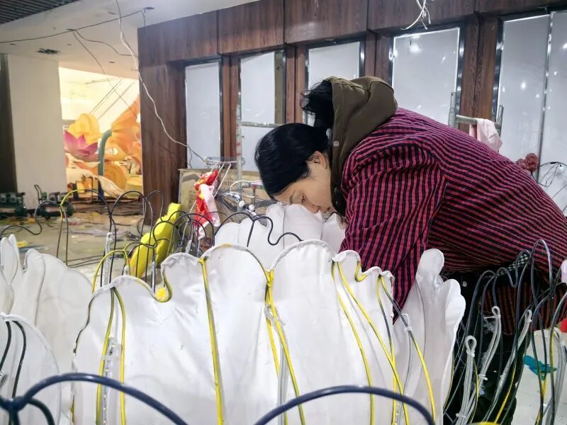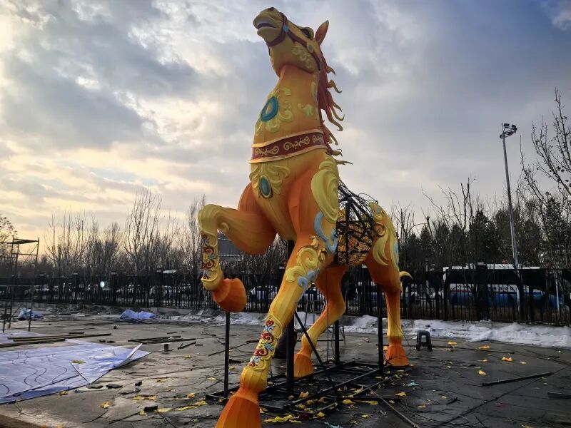 1月14日,在七彩广场邻近的灯彩制造区,放样、焊接、造型、裱糊、美工……手艺演员分工清晰、默契协作,现场一派繁忙现象。这批工人从1月初便投入灯彩制造,通过多道精密工序,快马、鳌鱼、荷花、锦鲤、小鹿、马车等多元元素的灵动概括已开始勾勒,覆以色彩艳丽的丝绸面料、装入LED灯珠后,一个个雏形初现的灯组颇具神韵。