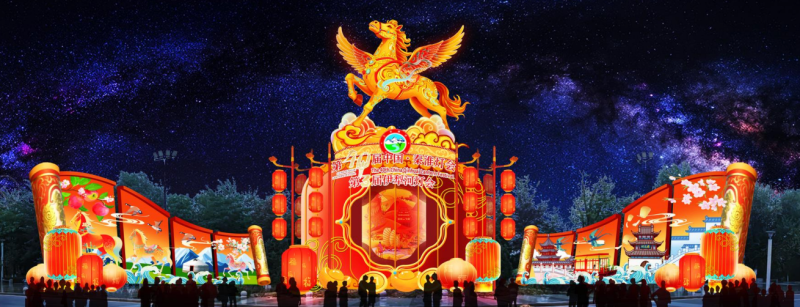 “主灯连续前两届属相文明主题,选用金色飞马造型,下方调配传统走马灯,全体规划为灯笼款式。灯笼中心可旋转,图画选用《千里江山图》,涵义中华大美河山。”李涵说。