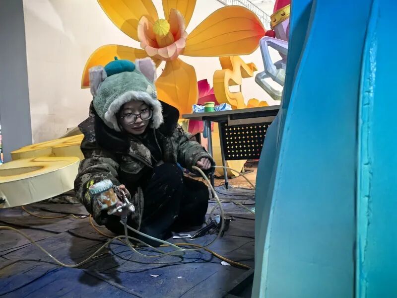 值得一提的是,80余人的制造部队中,有8名专业院校的“00后”结业生,为非遗灯彩传承注入新鲜血液。“00后”美工师郭宇欣结业于四川轻化工大学美术规划专业,这是她初次在伊宁参加灯彩制造。
